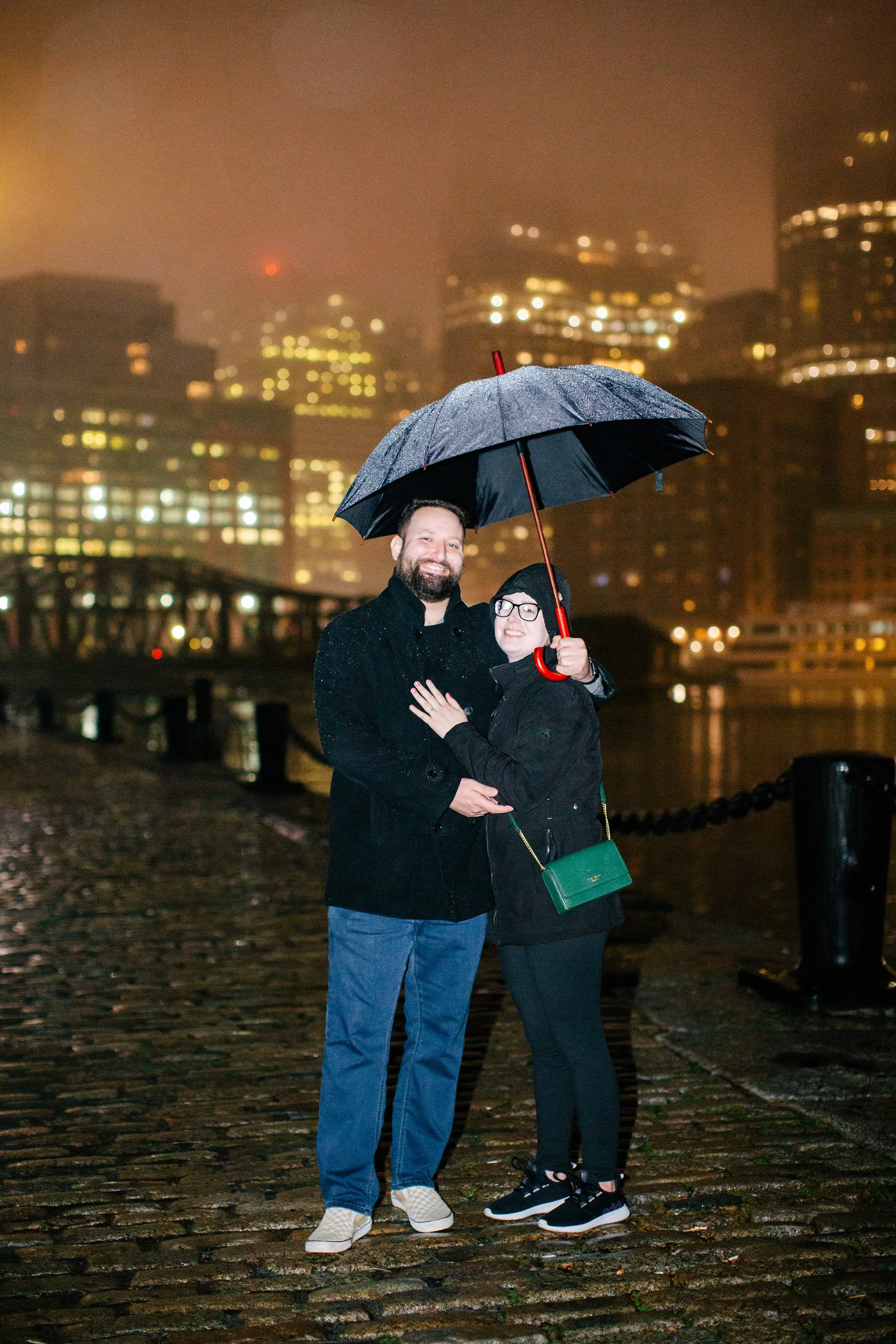 Jacob proposed to Lauren on a rainy evening on New Year’s Eve and Fan Pier Park in Boston. This was the first rainy proposal I have photographed, and it was worth it! While we did get wet and a bit chilly, it made for a beautiful quiet evening. There weren’t many people out on this rainy night, despite it being NYE, so we really lucked out. Fan Pier Park has quickly become a popular spot for proposal photos, and I can now say I’ve photographed here in every season and type of weather. After Jacob asked Lauren the big question, she said yes, and we walked over to Snowport, where some Christmas lights were displayed, which made for a pretty backdrop for more photos.